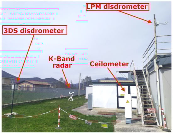 Data analyzed in this study are collected in Casale Calore (42.383081 N, 13.314806 E, 683 m ASL, an instrumented site in Central Italy equipped with a pair of co-located LPM and 3DS (Figure 1) and managed by the University of L’Aquila and Center of Excellence in Telesensing of Environment and Model Prediction of Severe Events (CETEMPS). LPM and 3DS are operated for a campaign called CORE-LAQ (Combined Observations of Radar Experiments in L’AQuila) conducted with the Institute of Atmospheric Sciences and Climate (ISAC) of the National Research Council of Italy (CNR) to test precipitation and Doppler parameter retrievals from radar profilers operating at W- and K-band frequencies (94 GHz and 24 GHz, respectively) [27]. The observatory is located in a valley with a temperate climate, with warm summers and without a dry season (Köppen–Geiger-type Cfb). On average, annual precipitation is 620 mm, autumn being the rainiest season, with chances of snow episodes between December and March. From December 2022 to July 2023, CORE-LAQ provided the opportunity to assess in both rain and snow the 3DS of the Italian National Antarctic Research Program (PNRA) before its installation at the Italian Mario Zucchelli research station in Terranova Bay, Antarctica. The 3DS was shipped to Antarctica on July 2023, while the LPM continues routine acquisitions at the Casale Calore site.