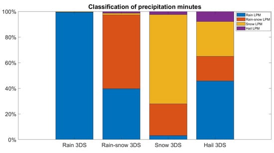 The first part of this section deals with the comparison between LPM and 3DS classification of particles. The mask applied by the manufacturer for classification is not known, nor the minimum number of hydrometeors belonging to a specific class that must be detected in a minute for providing a given classification. However, both disdrometers provide information on precipitation type by means of 13 precipitation classes as defined by the WMO (Word Meteorological Organization) codes (i.e., Table code 4677). The detection analysis is applied to four precipitation types, obtained by grouping different WMO classes with similar characteristics. In particular we considered the following precipitation types: rain (SYNOP codes 51, 53, 55, 58, 59, 61, 63, and 65), rain with snow (SYNOP codes 68 and 69), snow (SYNOP codes 71, 73, 75, and 77), and hail (SYNOP codes 87, 88, 89, and 90) [37].