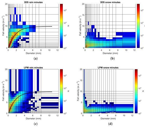 This section examines the performance of the two disdrometers in terms of fall velocity measurements by analyzing and comparing the raw data collected by LPM and 3DS during the common minutes in rain or snow events. With the aid of the spectrograms related to all the precipitation events, statistics on the terminal drop fall speed as a function of the diameter class are provided as shown in Figure 4.