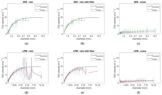 Statistics on terminal fall velocity with respect to diameter class (median value, first and third quartiles, and maximum and minimum) for (a,d) rain events; (b,e) rain events with filter; (c,f) snow events. Top line refers to 3DS, the bottom line to LPM. Black curves represent the theoretical speeds provided by Formula (3) for raindrops, LH for snow particles.