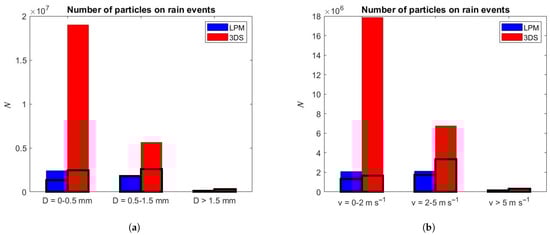 Barplot of the number of particles (N) detected by LPM and 3DS during rain events as a function of (a) diameter; (b) terminal fall velocity. Black lines mark the filtered values.