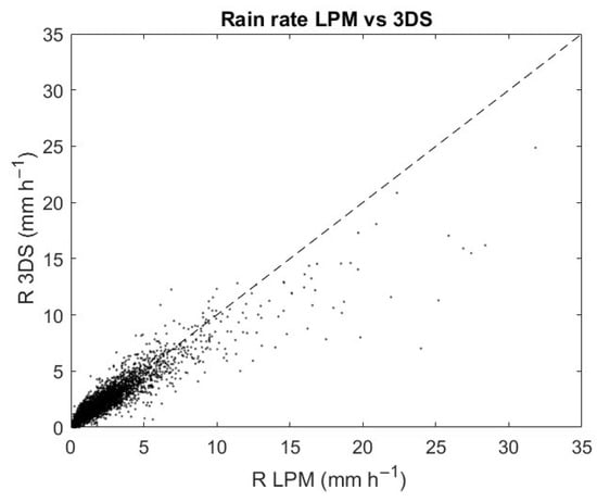 Scatterplot of rain rate detected by LPM (x-axis) and by 3DS (y-axis) during the common minutes of rain events from 13 December 2022 to 19 July 2023.
