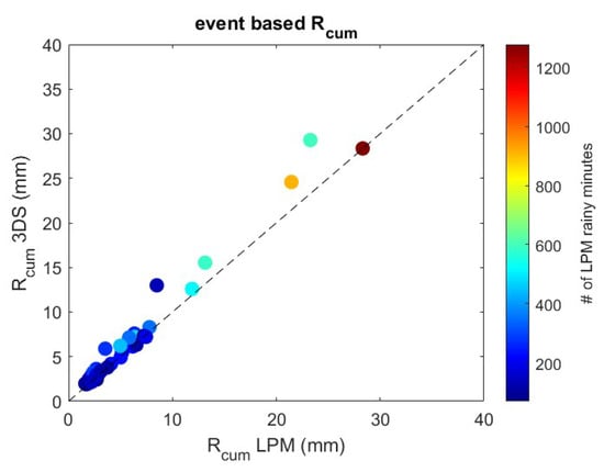 Scatterplot between event-based rainfall accumulation via LPM (x-axis) and via 3DS (y-axis).