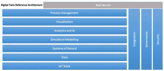 To develop a Digital Twin, it is essential to understand each of the actors involved in the process. In order to establish a foundation for the development of Digital Twins, the article developed by Standfor-Clark et al. [21] presents a reference architecture for Digital Twins, consisting of seven layers that define the different functionalities of the Digital Twin and three cross-cutting layers responsible for the governance, security, and integration of Digital Twin elements (see Figure 1).