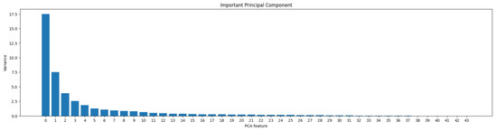 Given the high number of variables and their interrelationships, dimensionality reduction techniques were deemed necessary to aid in model training. The correlation matrix visualization allowed the identification of many variables that were related to each other [37], making it possible to select the most important ones and discard the rest. Nevertheless, a Principal Component Analysis (PCA) algorithm was used to reduce dimensionality, by choosing which variables of the project are relevant to be used in training the system [38], whilst keeping the most significant information from the dataset’s features, revealing the variance contribution of each. Upon analyzing the results, it was observed that the most significant variance was encapsulated within the first 10 components, with the variance diminishing progressively, following a pattern resembling a negative exponential curve (see Figure 3).