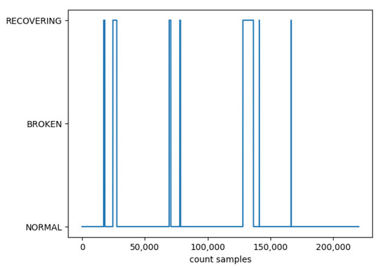 Before starting with the training, the distribution of samples in the dataset was analyzed, showing that cases of normal operation are much more frequent than breakdown and recovery cases, and that all recovery cases follow a breakdown. Therefore, it was decided to identify breakdown and recovery cases in the same way, the model’s purpose being to anticipate breakdown situations, and predicting either a breakdown or recovery in the future serves the same purpose of anticipation. This is shown in Figure 4, where the transition from ‘normal’ to ‘broken’ was always followed by a ‘recovering’ and a return to ‘normal’.