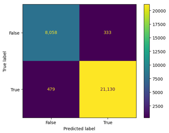 Upon examination of the test set, it was noted that of the samples labeled as either breakdown or repair—which are critical states for predictive maintenance—only 333 were incorrectly classified as normal operation, constituting roughly 4% of the total sample size for malfunctioning states. Conversely, when considering samples labeled as normal operation, the model misclassified a mere 479 as potential breakdown or repair conditions from a total of 21,609 cases, amounting to less than 2.1% of the normal functioning sample pool. These figures underscore the model’s high accuracy in distinguishing between normal and malfunctioning operational states, validating its efficacy for maintenance applications (see Figure 5).