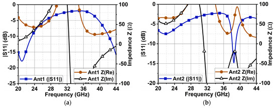 The proposed antenna performance was analyzed with the aid of CMA in Section 2. This section validates the antenna performance in terms of reflection coefficient and impedance matching. Figure 7 shows the dimensions of the antenna structure. Generally, the monopole antenna is half-wavelength or quarter-wavelength; in the case of an antenna on the outer ring with a feed line (Ant1) (Figure 1a), the sum of the circumference of R1 and feed length LF is 13.83 mm which is almost equal to one wavelength. It resulted in resonance at 21.67 GHz, as depicted in Figure 8a. However, the bandwidth is very narrow due to inductive reactance. With another circular ring (R3–R4) added (Ant2) in Figure 2a, a resonance at 38 GHz was observed in Figure 8b, because the circumference length of R3 was one wavelength. Further addition of R5 and four equilateral triangles (Ant4) combined the previous resonances, consequently leading to a broad bandwidth. The impedance was finetuned by varying the ground length, leading to a final bandwidth ranging from 23 to 41 GHz, as shown in Figure 8d. The designed antenna’s overall impedance (Z0) was (50 ± j20) Ω. The structure resulted in a linear change in minor capacitive reactance to inductive reactance. This is due to a combination of capacitive and inductive modes, as presented in Figure 4c.