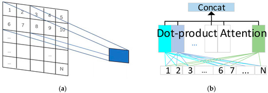 Comparison of the different feature extraction methods of CNN and transformer. (a) Convolutional Kernel; (b) Multi-head Self-attention Mechanism.