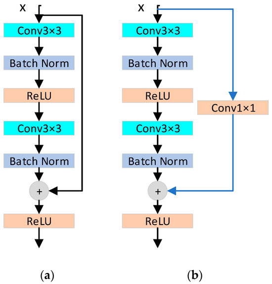 The residual basic block of ResNet. (a) The dimensions of input feature and output feature are consistent; (b) The dimensions of input feature and output feature are different.