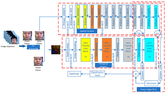 To achieve optimal MER performance with limited ME data, our deep learning MER architecture implements a two-stream architecture with two inputs. The first input is a single frame containing the spatial information of the video, while the second input is the interframe optical flow containing the temporal information of the video. To capture the local and global relations of the adjacent area in optical flow simultaneously and minimize computation, our temporal encoder uses the Swin Transformer architecture [15], which is based on MSM. This hierarchical transformer uses shifted windows to compute its representation, enabling self-attention computation to be restricted to non-overlapping local windows while allowing cross-window connections. As a result, it can automatically capture the local and global relationships of different regions in a single window simultaneously. The Swin Transformer has linear computational complexity with respect to image size, whereas the computational complexity of ViT is quadratic with respect to the image size. The primary function of the spatial encoder is to extract static face texture features. Therefore, the global relationship between different spatial regions can be ignored to reduce computation. For this purpose, our spatial encoder adopts the ResNet architecture [16], which is based on a Convolutional Kernel. Furthermore, to match the subsequent feature fusion algorithm, the layers of each stage of the ResNet architecture are adjusted to be consistent with each stage of the Swin Transformer. This modified ResNet architecture is named ResNet13, according to the number of convolutional layers.