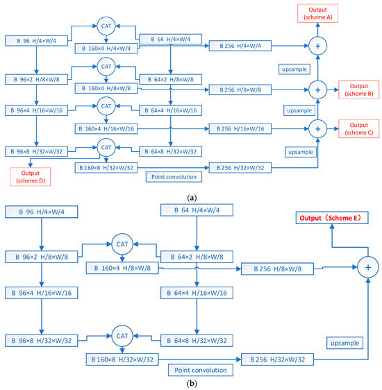 Different feature fusion schemes. (a) Scheme A~D; (b) Scheme E.