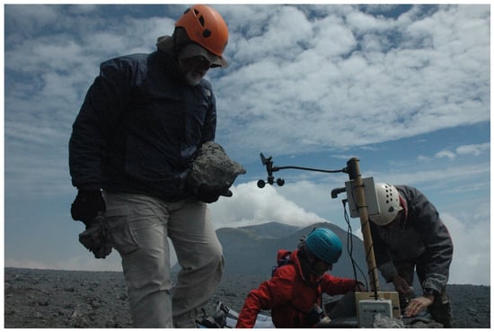 The interest in monitoring fumarole temperatures was also explored at Mount Etna [16]. The time variation in the temperature of a fumarole located in the summit area was recorded from July to September 2008 using two sensors located along a fracture near the rim of the volcano’s central crater. In another study of hydrothermal processes governing the geochemistry of fumaroles fields near summit area, soil temperatures were acquired hourly at depths of 10 and 30 cm by automated stations based on data loggers connected to digital temperature smart sensors [17]. Temperatures were measured every 4 min and their hourly averages were stored in the permanent memory of the logger. This experiment showed that the continuous monitoring of soil temperature in fumaroles located around the craters is feasible, and it could help evaluate the volcano state of activity [17].