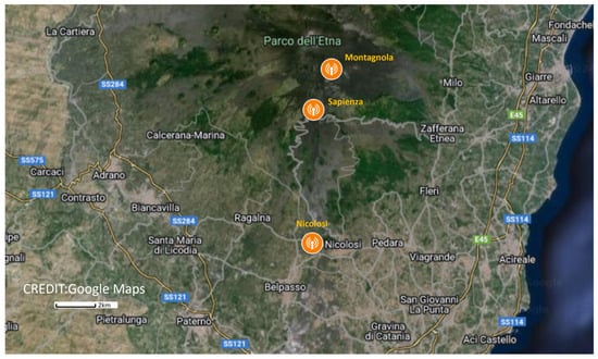 Location of LoRaWAN gateways on Etna. To extend the range of the first gateway, located 2.5 km south of Etna summit craters in a shelter, a second gateway was installed in Nicolosi on the top roof of a school in Nicolosi (10 km south of Etna summit) in September 2021. A third gateway was added at Sapienza touristic area at 1900 m above sea level.