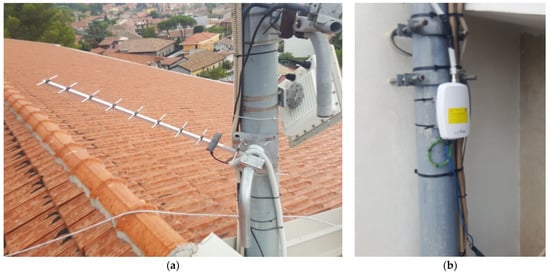 Layout of the gateway set-up on the roof top of Dusmet school in Nicolosi including a Yagi-type antenna pointing toward the Etna summit (a) and the Kerlink gateway at the bottom of the same mast connected to the antenna and to the power grid (b).
