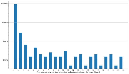 Figure 6 displays, on a logarithmic scale, the elapsed time between the measurement and its transmission at DR = 5 by the ESAM node that was configured to transmit data once an hour. The figure confirms that more than 90% of the data are transmitted within one hour, and therefore at the first attempt. It also shows that data have been transmitted up to 20 h after their production. Because of the short distance—a few meters—between the ESAM node and the gateway installed at Sapienza, the 7% failure rate of the first transmission cannot be explained by a weak LoRa signal. The transmission loss is more probably due to some interruptions in the internet access through the site’s 4G coverage. The use of Wi-Fi or a wired internet connection as available at this location could significantly improve the robustness of the backhaul link.
