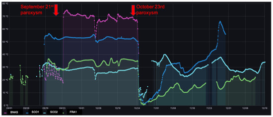 As can be seen in Figure 9, no significant change in any of the four temperature recordings was observed before the eruptions or in the following 24 h. Significant changes were instead observed later on, but their interpretation requires further investigation that is beyond the scope of this paper.