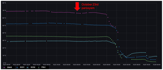A simultaneous steep decrease in all temperature measurements was observed on 24 October between 12:00 and 20:00 PM UTC + 1 time, just 24 h after a paroxysmal event. Its interpretation must also take into account the extremely heavy rains that hit the eastern part of Sicily that same day, resulting in heavy snowfalls at high altitude. To confirm the meteorological origin of the observed temperature drop, Figure 9 displays a comparison of the temperature profiles in the 3 days before and the 3 days after the paroxysmal events that occurred on 23 October.
