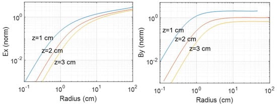 For the figure-8 coils considered in this work, the scaling relationships for the idealized structure outlined above were determined using the electromagnetic equations given in the Supplementary Materials. In a practical case, the electric field of interest is located under the point of intersection of the two sides of the coil and is oriented in the direction of the current (designated here as the x direction). The associated magnetic field is in the perpendicular y direction. Figure 1 shows the calculated electric field Ex and magnetic field By as a function of coil radius R and depth z from the plane of the coil. The fields were proportional to the current through the coil and number of turns (assumed to be overlapping), and were normalized in the figure to the values obtained at z = 2 cm and R = 10 cm. It was found that, as R was scaled at a fixed current I, the change in the B field was relatively small until R approached z. The scaling of the E field was significantly stronger. For the reduction in R from 10 cm to 1 cm, for example, the B field at a depth of 2 cm dropped by approximately 4× for a fixed current, while the electric field dropped by 16×. Importantly, therefore, system designs to maximize B fields differ from system designs for maximizing E fields. In this context, it must be recognized that, within the patient’s brain, it is the induced E-field that triggers neurophysiological responses to create desired therapeutic effects. A more detailed theoretical discussion is provided in the Supplementary Materials.