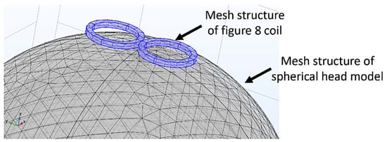 COMSOL mesh structure of a figure-8 rTMS coil on a simplified human head.