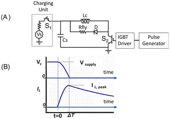 System monitoring relied on a Hall effect sensor and a Rogowski coil. The Rogowski coil with a current waveform transducer (Power Electronic Measurements, Inc., Nottingham, UK) measured the high-speed current pulse . The capacitor voltage was measured on an oscilloscope. Hall effect magnetic sensors (DRV5056, Texas Instruments, Dallas, TX, USA) were placed at various distances from the center of a coil loop to measure the magnetic field (B-field) strength along the z-axis. The x-directed electric field was measured in air as a function of distance from the bottom of the coil. The measurement employed a “pickup” coil consisting of a straight wire segment of length Ls = 1.2 cm, oriented along the direction of the electric field, and additional perpendicular wire segments that extended well beyond the region of the induced electric field (and were perpendicular to the induced electric field). The pickup coil was connected to a high-input-impedance oscilloscope to determine the time-dependent coil voltage V(t), from which the electric field E(t) = V(t)/Ls was calculated (see Supplementary Material for further detail). The pulsed stimulus current to the coil was provided with the switching inductor/capacitor circuit shown in Figure 5A. A diode-connected current return path was used to produce a monophasic current pulse. The capacitor was fully charged to the supply voltage (Vsupply) and then discharged through the inductor, producing a current pulse with peak current when the capacitor voltage dropped to zero (Figure 5B). For the waveform described here (similar to the waveforms of numerous other systems), the maximum voltage occurred at the beginning of the pulse (corresponding to highest dI/dt) and the maximum current at the time ΔT, when the induced electric field dropped to zero. The current waveform during this period followed approximately sinusoidal behavior for one quarter wave of the period of the LC resonant circuit formed between the coil and the storage capacitor, given by