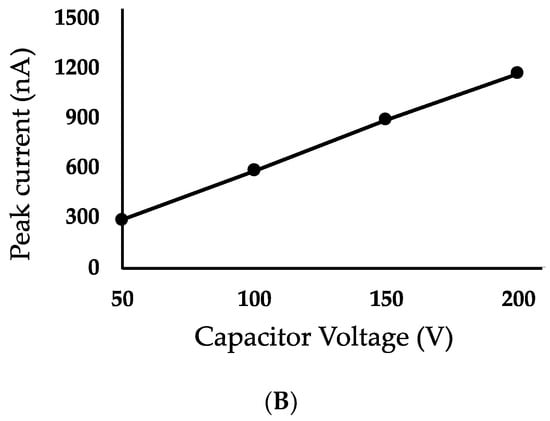 The design of the circuit was assisted by the use of a transient circuit simulator, ADS from Keysight Technologies. The prototype circuit shown in Figure S1 was implemented on a printed circuit board using a switch S2 based on Si IGBTs (model IXXK300N60B3 from IXYS Corp., Chicago, IL, USA) with a maximum voltage of 600 V and a maximum pulse current of 1140 A; four IGBTs were connected in parallel to provide appropriate current handling (see Figure 5A). Diode D was implemented with a parallel combination of Si diodes IDW75D65D1XKSA1-ND from Infineon, Neubiberg, Germany. The IGBTs and diodes were sized to allow a current up to 3.5 KA in short (<100 ms) pulses. Drive voltage to the IGBTs was provided by IX21844N gate drivers from IXYS Corp., Chicago, IL, USA, and turn-on and turn-off times were estimated to be below 0.3 ms. The main discharge capacitor C was a Kemet model C4DE 380 mF with non-inductive winding and a metallized polypropylene film dielectric rated to 400 V. The capacitor used a polymer dielectric to ensure high pulse current carrying capability. The initial voltage Vo was varied up to a maximum of 350 V using an external supply, although a separately demonstrated PCB-based boost converter could provide this voltage starting from a 20 V battery and connected to C by a switch S1 with controllable timing to allow C to be charged when appropriate.