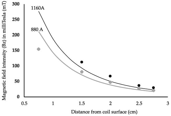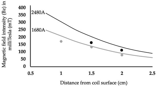 The B-field simulation and experimental results were compared to ensure consistency between the simulation and the experiments. The results are shown in Figure 7 for the 62 mm coil A with electrical current peak values of 880 A and 1160 A. The current pulse width was 83 µs. Figure 7 compares the magnetic flux density at various points along the z-axis, i.e., distance or depth from the center of a coil loop, for simulated and measured values.