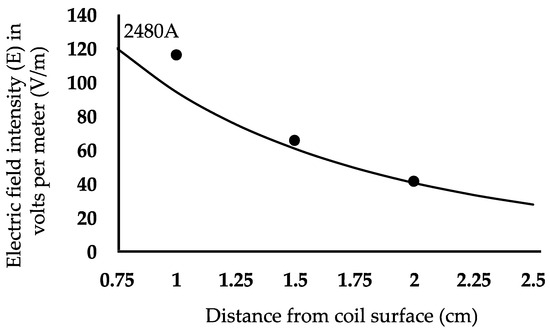Graph showing E-field data for a COMSOL simulation versus experimental measurement using a 76 × 38 mm (12.6 g) figure-8 coil (coil B) with I = 2480 A. The solid line represents the simulation plot, while the filled black circles denote experimentally measured values.