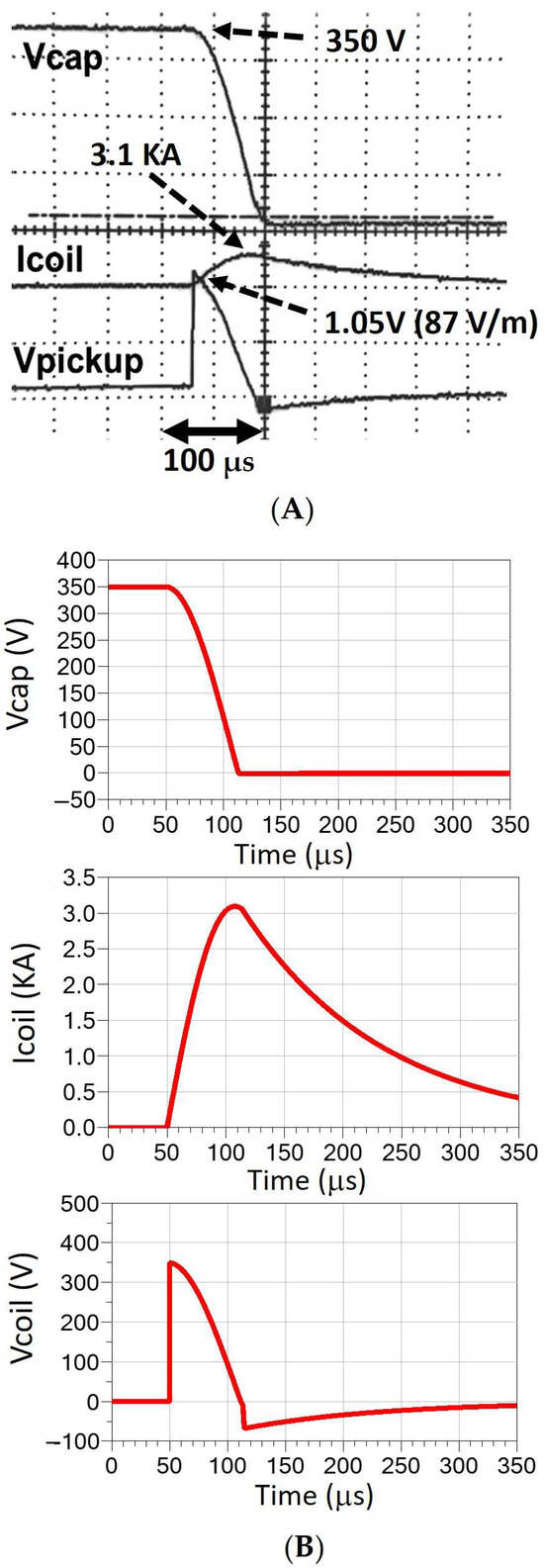 Coil B was tested using peak currents of 1680 A and 2480 A for capacitor voltages of 200 V and 300 V, respectively. The pulse width was 55–60 µs. We measured both the B- and E-fields in air. We also performed COMSOL simulations for B-fields and E-fields using the head model. Comparisons between the simulations and the experimental results are shown in Figure 8 for the B-field and in Figure 9 for the E-field. In order to test the maximum E field that could be generated with coil B within the Vmax and Imax limitations of the switch used, we also measured the system performance with Vcap = 350 V and resulting Imax = 3.1 kA. Figure 10A shows pulses for capacitor voltage (Vcap), coil current (Icoil), and pick up coil voltage (Vpickup), representing the monophasic pulse. The corresponding E field at 1.5 cm depth was 87 V/m. Figure 10B shows the simulated values of the waveforms, which can be directly related to measured values.