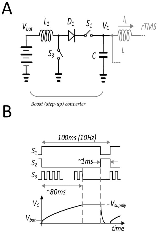 An additional important consideration for the system’s implementation is the maximum voltage needed. With the designed coils, the clinically relevant electric fields can be achieved with a power supply value of 350 V, while clinical systems described in Table 3 require 1200 V or higher. The use of such high voltages creates significant requirements for electrical insulation and safety interlocks, and leads to larger and more costly electrical components such as capacitors and switches. Accordingly, with their significantly lower weight, size, voltage, and power requirements compared with rTMS systems in current clinical use, the miniaturized systems described here could have potential for mobile or portable operation using battery-based power sources. Certainly, achieving portability at 350 V is a challenge, and we note in this context that a boost converter is available in our system, although not used in all of the coil-related experiments, to make improved use of available power and to provide the rTMS pulses using a 20 V battery, as shown in Figure 12.
