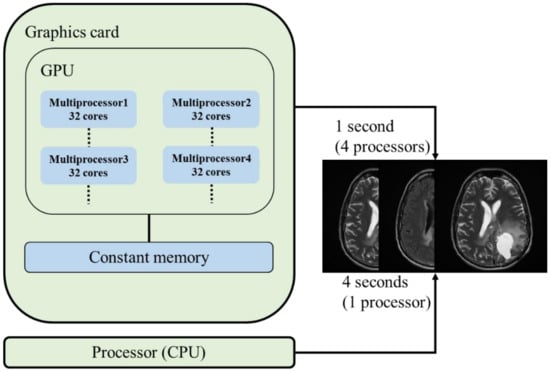On the other hand, the most frequently used medical imaging modality for brain imaging is magnetic resonance imaging (MRI), followed by computed tomography (CT), positron emission tomography (PET), and ultrasound [10,11,12,13]. In basic terms, MRI has been widely utilized to analyze the anatomy of the entire brain [14]. The brain, spinal cord, and vascular architecture can all be seen in high detail on an MRI machine because of its strong contrast. Moreover, this method is safer than CT because it does not use radiation [15]. The three most often utilized MRI sequences are FLuid Attenuated Inversion Recovery (FLAIR), T1-weighted, and T2-weighted [16,17]. MRIs are typically performed using sophisticated, high-priced equipment, and computers as part of a medical evaluation process aimed at determining the best course of treatment for brain disorders. Furthermore, MRI data acquisition and image rendering are time-consuming processes, and for this reason, accurate and quick brain MRI processing are required in order to expedite the process [18,19,20]. Also, because of certain artifacts in brain MRI images, image segmentation is thought to be one of the most challenging tasks when processing these images. Three purposes are served by GPU-based medical image segmentation: first, it allows for the comparison of several candidate image segmentation algorithms; second, it makes the segmentation of large datasets easy and automated; and third, it enables interactive GPU segmentation and visualization. These three combined goals facilitate the rendering of GPU memories at very high speeds [9].