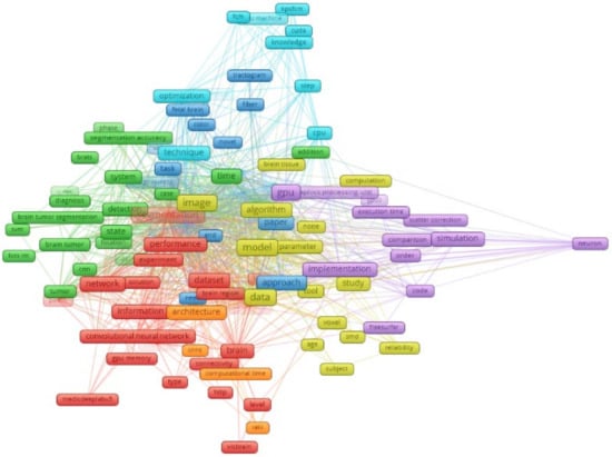 The VOSviewer software (version 1.6.20) [38,39,40,41] is used to create bibliographic connection between word clouds on GPU-based parallel processing for brain MRIs, as seen in Figure 2. Therefore, in Figure 2, there are a total of seven different clusters with different colors and 122 keywords shown for the timeline between 2019 and 2023. For instance, the occurrence of the keyword “GPU” is 61, and it has 113 links to other keywords in the figure. On the other hand, the occurrence of the keyword “segmentation” is 67, and it has 107 links to other keywords.