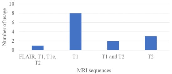 In Figure 3, we show the number of MRI sequences used in the previous studies from Table 2. According to this figure, the most used MRI sequence type is T1-weighted, and the sequence was used for different purposes such as segmentation [43] in 2023, image restoration in 2019 [52], reconstruction both in 2021 and 2022 [45,46], surface mapping in 2022 [44], and feature extraction in 2019 [54]. The second most used MRI sequence type is T2-weighted, and it was used for various tasks such as pulse sequence simulation in 2023 [42], reconstruction in 2021 [47], and simulation of a human head in 2021 [48]. The T1-contrast and the FLAIR sequences were used for the purpose of segmentation.