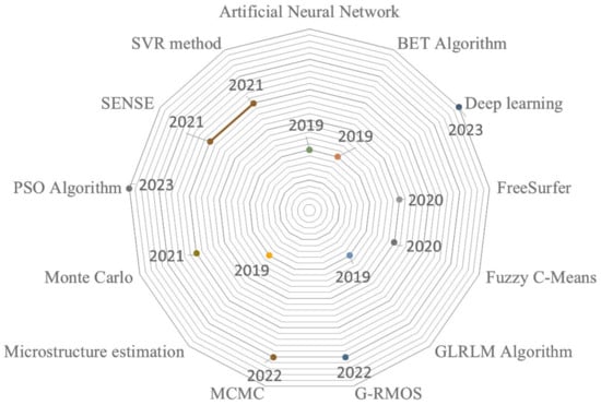 In Figure 4, we also show the usage of different methods for each year between 2019 and 2023. These methods were generally combined with GPU-based parallel processing for the analysis of brain MRIs. As seen from Figure 4, there are various methods and algorithms for analyzing brain MRIs for any purposes such as segmentation, reconstruction, and simulation of brain structure models.