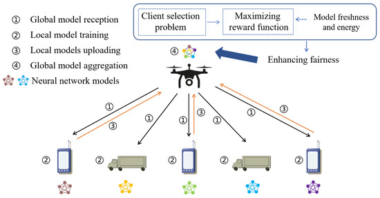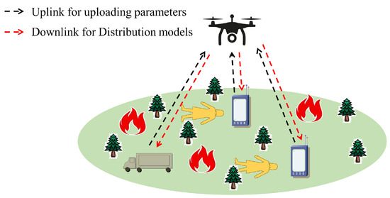 At the same time, emergency communication often faces problems such as unfixed locations and complex and changing terrain. So, the flexibility of unmanned aerial vehicles (UAVs) can be utilized to reach remote areas [6] and assist terrestrial devices in deploying models. Terrestrial devices collect ground data in the affected area through sensors and cameras, etc., and local models can be obtained by processing these data to detect and categorize targets [7]. However, terrestrial devices with limited energy cannot store a large amount of data while repeating training to improve the accuracy of the model. UAV-assisted communication provides a feasible solution, where terrestrial devices upload the model parameters to the UAV. Furthermore, the UAV assumes the responsibility of aggregating the parameters, which allows the UAV to share part of the training energy consumption for terrestrial devices.