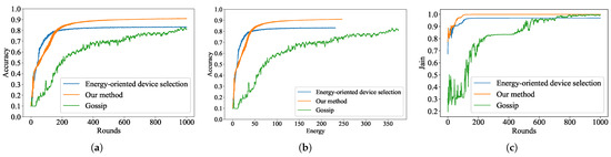 We evaluate the fairness of user scheduling using the Jain metric and display the results in Figure 3c. It is obvious that in our scheme, the Jain metric is closer to 1, which indicates that the accuracy of the terrestrial devices is almost the same with the help of the global model. This indirectly reflects that using the reward function for selection after weighting can give all terrestrial devices an equal chance to participate in the aggregation process of the global model. Energy-oriented device selection scheme schedules users based on only a single criterion, energy consumption. This destroys the fairness of device scheduling as the number of training rounds increases. The scheme has the lowest Jain value, and this simulation result proves our point. In contrast, in the gossip scheme, there is randomness in the selection of devices for the UAV, and this randomness increases the fairness of the system. However, this scheme has too much randomness, thus causing the Jain metric curve to be too oscillating when converging.