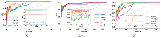 Then, we change the size of the parameter a in the FM function and display the results, as shown in Figure 4b. From the global plot, we can clearly observe that the a value has little impact on the overall Jain value and more impact on the rate of convergence of Jain values. We zoom in on the local details and compare with . Although the convergence is faster when , its convergence value is smaller. Therefore, we use when making comparisons with other algorithms.