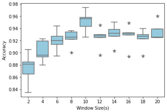 - Fida, B.; Bernabucci, I.; Bibbo, D.; Conforto, S.; Schmid, M. Varying behavior of different window sizes on the classification of static and dynamic physical activities from a single accelerometer. Med. Eng. Phys. 2015, 37, 705–711. [Google Scholar] [CrossRef]