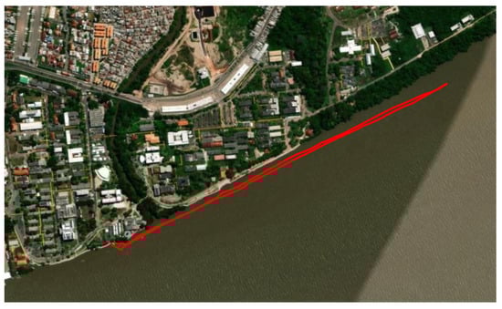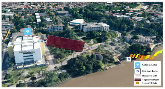 36]. The distance between the gateway and the end node was determined by GPS coordinates, and we adopted an average distance of 50 m between the drone and the UFPA coast along the entire route. The route is shown in