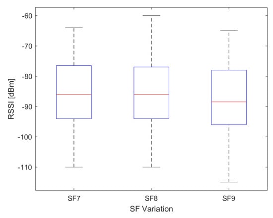 Box plot of the distribution of RSSI data measured, with −86 dBm, −86 dBm, and −88.5 dBm for the median (in red) of the data in SF7, SF8, and SF9.