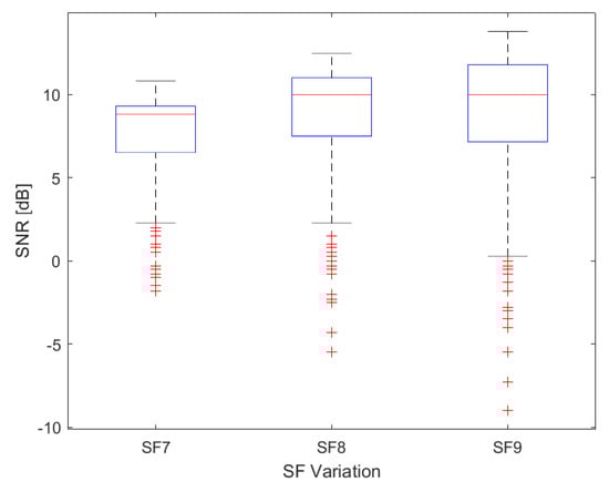 Box plot of the distribution of SNR data measured, with 8.8 dB, 10 dB, and 10 dB for the median (in red) of the data in SF7, SF8, and SF9.