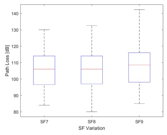 Box plot of the distribution of path loss variation of data measured, with 106 dB, 106 dB, and 108.5 dB for the median (in red) of the data in SF7, SF8, and SF9.