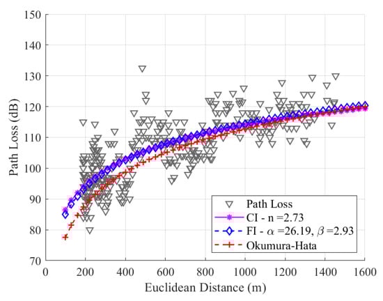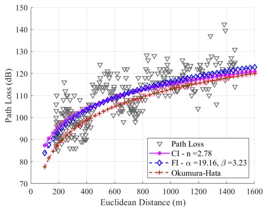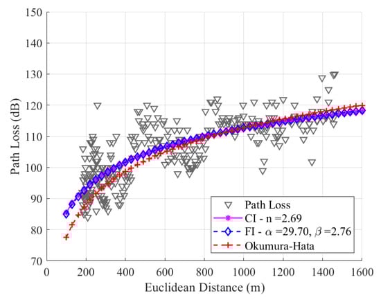 Path loss data and the modeling with CI, FI, and Okumura–Hata models for SF8.
