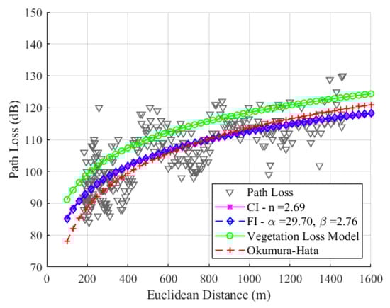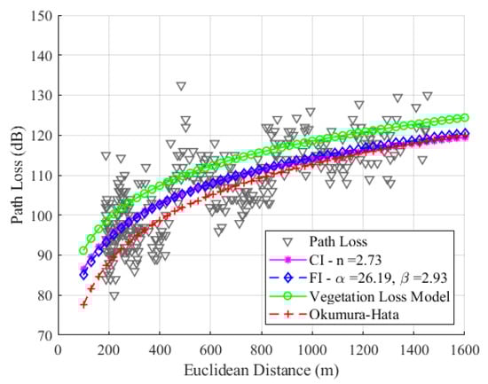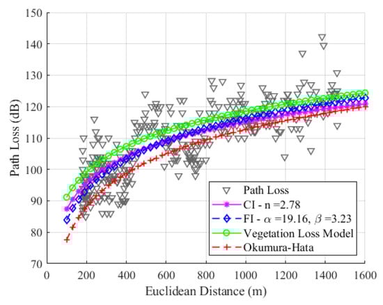 Path loss models for SF9 with CI (magenta), FI (blue), Okumura–Hata (red), and proposed vegetation model (green).