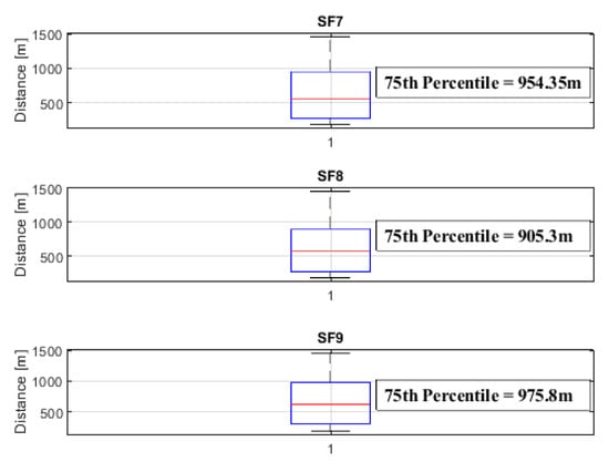 Box plot of the distribution of distance data in SF7, SF8, and SF9 with distance values of 954.35 m, 905.3 m, and 975.8 m representing the values of Q3 (in red) for the three SFs, respectively.