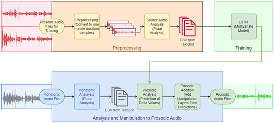 In order to train the LSTM, in the second stage, “training”, the output from the “preprocessing” stage is input into multiple multivariate LSTMs, which are utilized to enhance accuracy and prevent the interdependent variables from affecting the training. Stochastic gradient descent was selected as the optimization function, and mean squared error as the loss function. The third and final stage, “analysis and manipulation to prosodic”, performs the same “source audio analysis” as before but instead of analyzing the source data files now analyzes the monotonic sample. The monotonic sample is a male voice reading from a novel with monotone and singular staccato rhythm. The monotonic analysis of the robotic file is then input into the trained LSTMs in the task “prosodic analysis”, which uses the trained LSTM to create delta values from the original key elements of the robotic sample analysis table to create predictions of these values. The final task, “prosodic addition”, uses the predicted values from the LSTMs to create new layers in Praat for intensity, duration (used by the values of the delta of the length of the syllable, and for the deltas of the pauses before and after), and a pitch manipulation layer, which adjusts the frequency. Merging the manipulation layers with the source audio creates a prosodic audio sample from the robotic audio file.