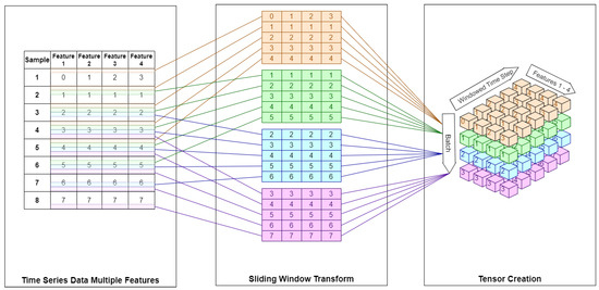 Initial experiments utilized time-series training based upon a fixed offset window of the first 60 elements as the source data, with the elements from 61 onwards being the target data. This was sufficient for univariate experimentation, but a general case was required to ensure scalability and additional testing of parameters, including changing the sliding windows of time-series data beyond a fixed number of 60 elements. The code pipeline was updated to add a function to convert an array into a sliding window multidimensional series from that array. The sliding window function takes parameters of the array passed to it and the number of steps () to include in each sliding window. The input array is then iterated through, one element at a time, along its first axis, and the element and elements are then copied to an output array with an extra dimension, so that the output array contains a series of sliding windows of the input array. Utilizing this method allows for multidimensional inputs to be grouped together as interdependent inputs, and allows for a sliding window to be assigned to a single output variable. A visual representation of the sliding window is shown in Figure 2, which demonstrates the transformation from time-series data of multiple features to a sliding window, which is then converted into a 3D tensor.