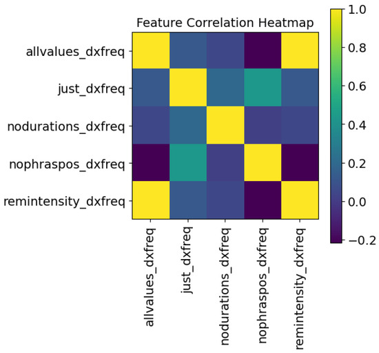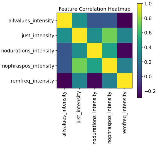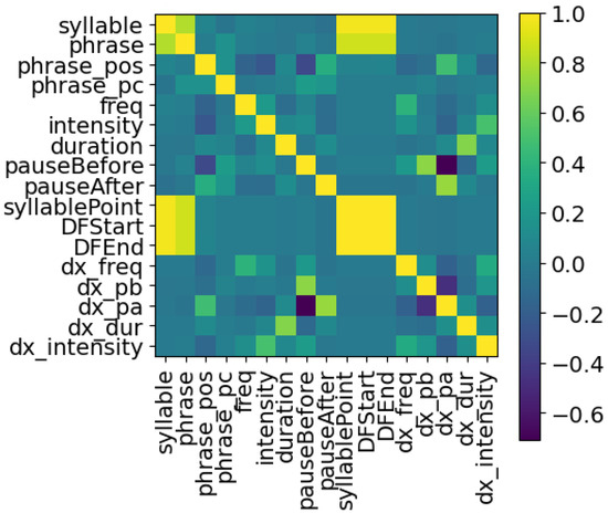 The logic table of Table 1 explains which inputs were used to predict each target. Note that each target has its own trained LSTM. The phrase number, the size of the syllable within the phrase, and the syllable’s position within the phrase are used for all outputs. The target variables are themselves an input to other targets—this helps to improve the model, as if this was a multivariate output these variables would not be usable as input to the training. A Pearson correlation coefficient heatmap is shown in Figure 3. The “syllable point” variable is used for the recreation of the voice after training and is removed for the LSTM training: removing highly correlated data points is important to ensure the data points are orthogonal.
