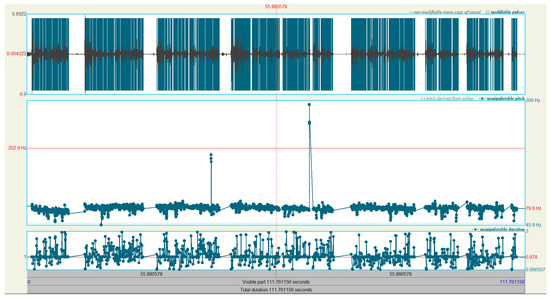 Praat manipulation layers are utilized to effect the LSTM predictions, these manipulation layers are titled “pitch tier”, “duration tier”, and “intensity tier” in the software. Figure 4 and Figure 5 show these tiers, with an example of values in each layer from the LSTM, as only the pitch tier is auto-populated. Figure 4 contains three window panes; the top pane displays a two-minute snapshot of the non-prosodic audio sample pre-manipulation, the y-axis represents amplitude, and the x-axis shows time.
