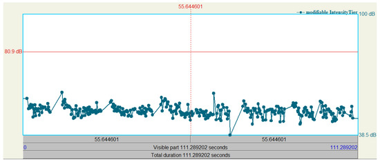 Figure 5 shows a single pane with the intensity tier only, here the connected points set the intensity to a specific value. If using Praat in an interactive mode, the frequency layer is automatically populated from analysis of the audio file, and the duration and intensity tiers have no points; the automation creates each of these layers from the LSTMs’ predictions and utilizes the feature set of Praat to apply the changes to the original audio. The duration tier has three times as many points as the others as it has duration adjustments for each syllable, the pause before, and the pause after each syllable.